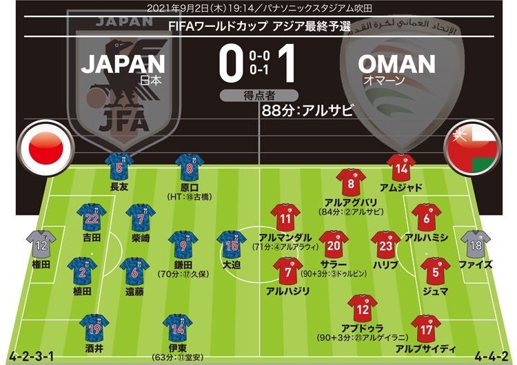試合前から激しい雨が降り、水しぶきが上がるエリアもあるなど、序盤はパスがつながらずテンポも上がらない。前半の途中から少しずつ、オマーンのゴールに近づいたが、後半は一進一退の展開。53分には右サイドを突破され、長友のエリア内でのハンドを取られるも、VARの介入で取り消しとなる、心臓に悪い場面も。全体的に身体が重そうで、試合終了間際にまさかの失点。重要だったホームでの最終予選初戦で敗れたのは痛すぎる。今はこれからの奮起に期待するしかないだろう。